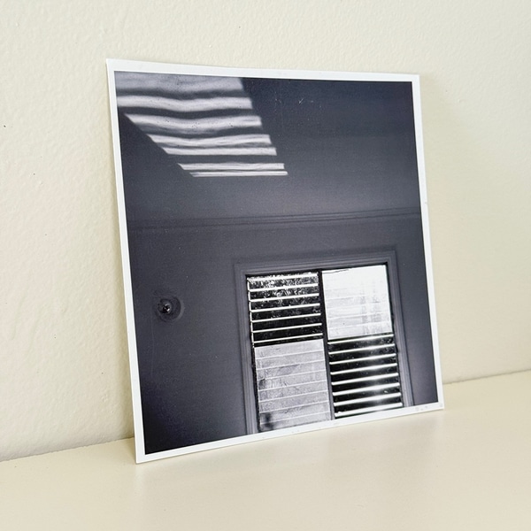 B&W photograph of a window with open blinds casting sunlight on ceiling. Image is cleared for use. **Please note high replacement cost**