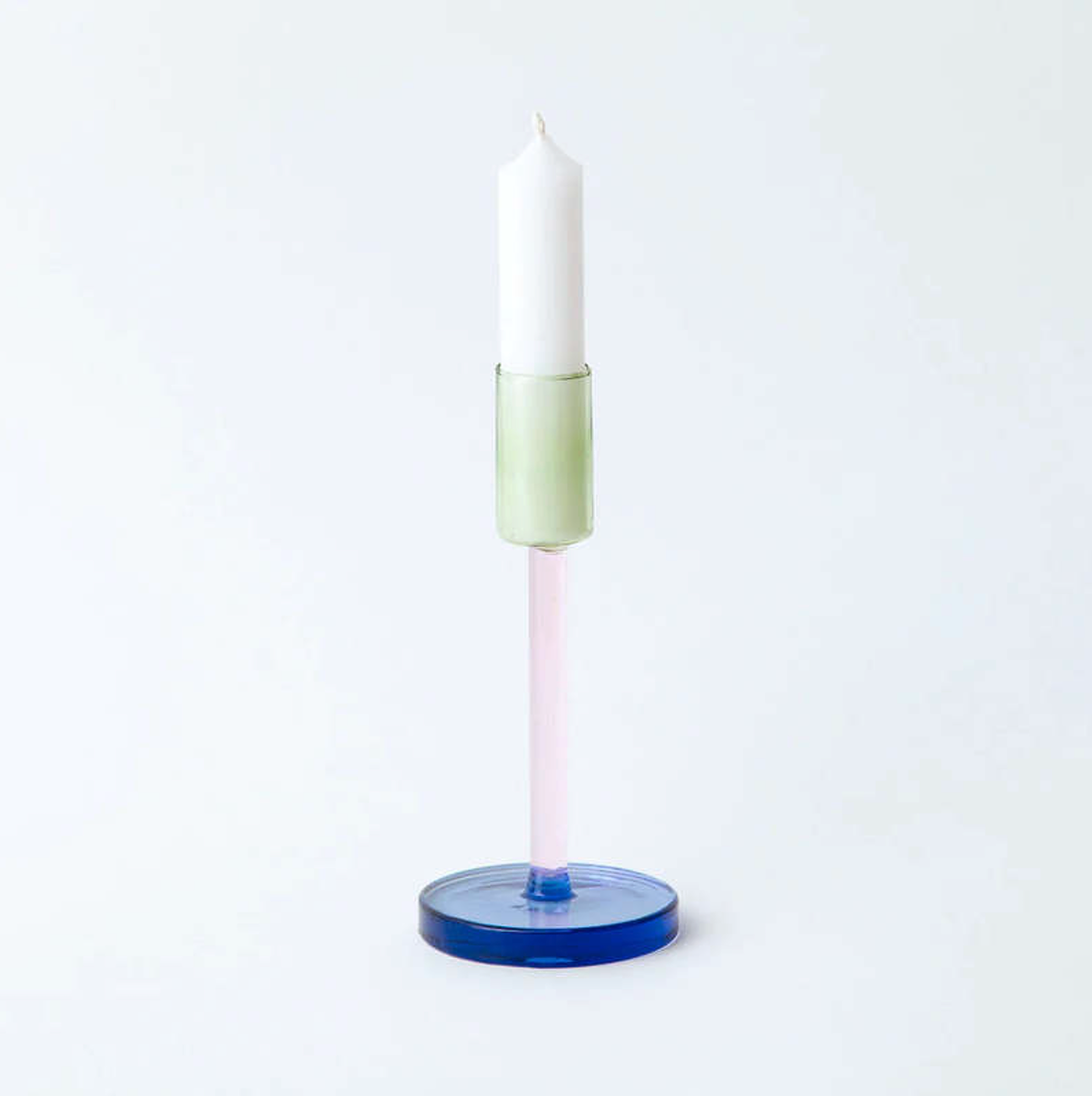Tall glass candlestick holder with blue base and pink stem.