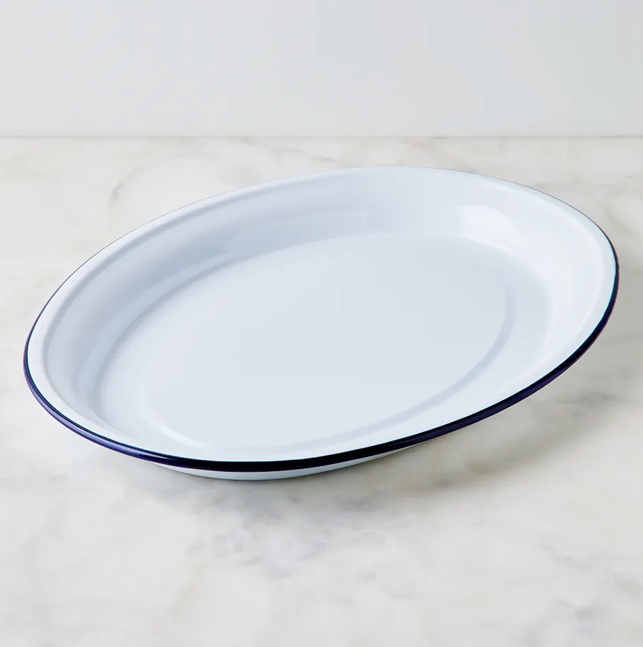 White enamel oval serving platter w/ blue rim.