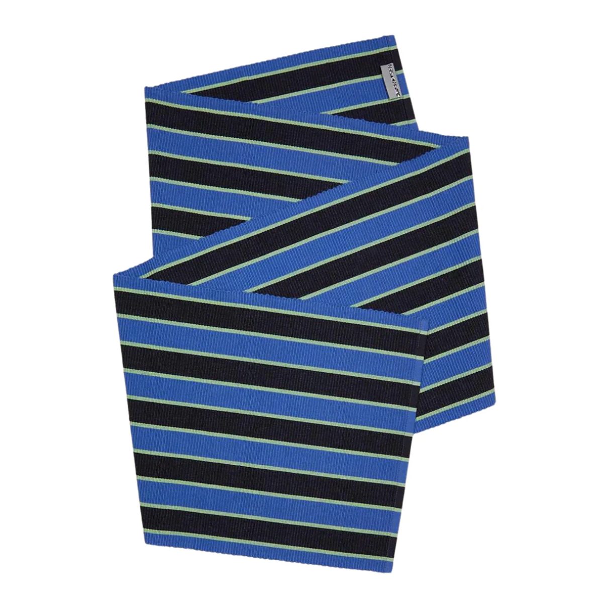 Cotton runner in blue, black & sage green tri-color stripes with a ribbed texture.
