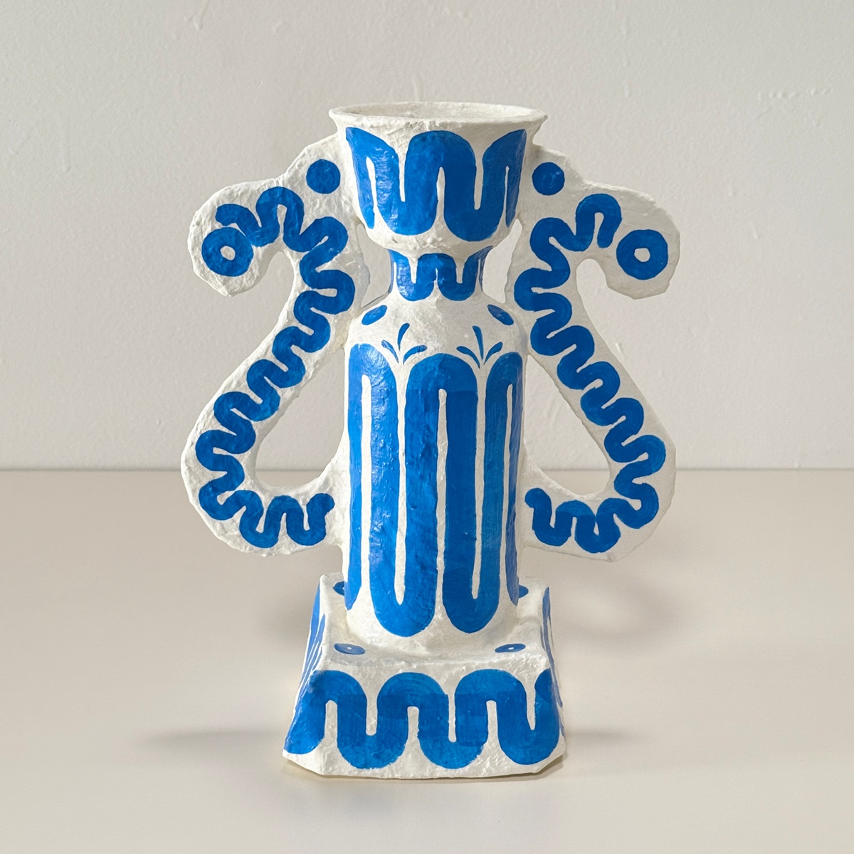 White & blue papier-mache "Waste Vase". NOT WATERPROOF, for dried goods or display only.